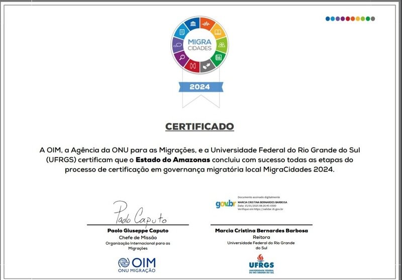 Pelo segundo ano consecutivo, o Governo do Amazonas recebeu o Selo MigraCidades, certificação internacional que reconhece o avanço de políticas públicas e de práticas de inclusão social, que possibilitam a integração de migrantes na sociedade. O selo é concedido pela Organização Internacional para as Migrações (OIM), Agência da Organização das Nações Unidas (ONU), em parceria com a Universidade Federal do Rio Grande do Sul (UFRGS).