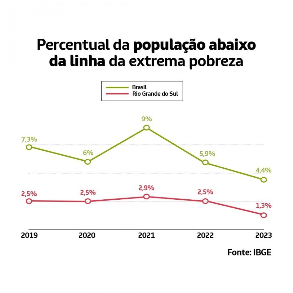 Pela primeira vez, o Rio Grande do Sul alcançou a menor taxa de extrema pobreza entre os estados brasileiros. De acordo com a Síntese de Indicadores Sociais – relatório divulgado pelo Instituto Brasileiro de Geografia e Estatísticas (IBGE) na quarta-feira (4/12) –, em 2023, apenas 1,3% da população gaúcha vivia com rendimento mensal per capita de R$ 209, o que representa uma queda de 48% na comparação com o índice de 2019. No Brasil, o indicador dessa faixa de renda caiu 39,7% no mesmo período.